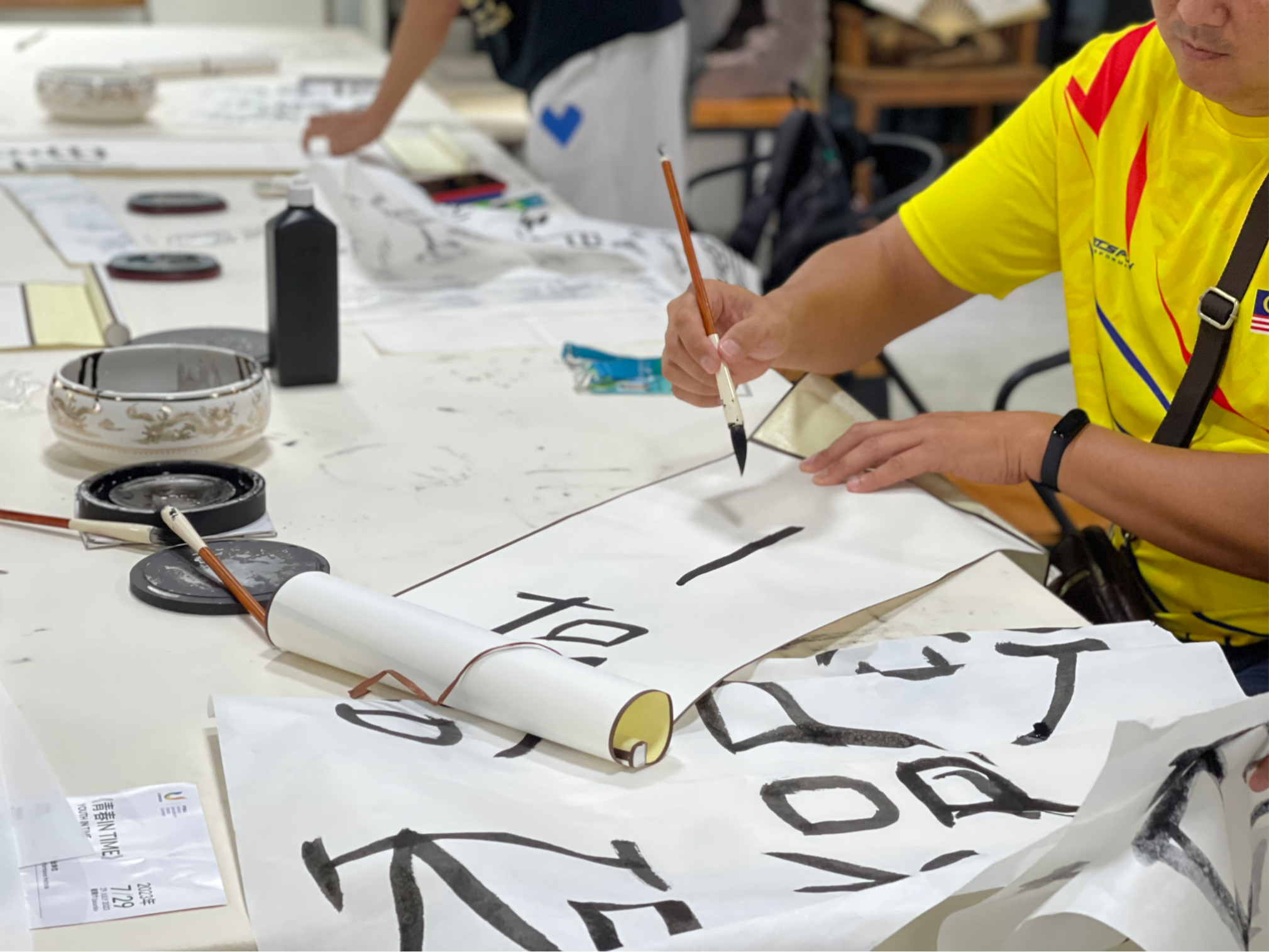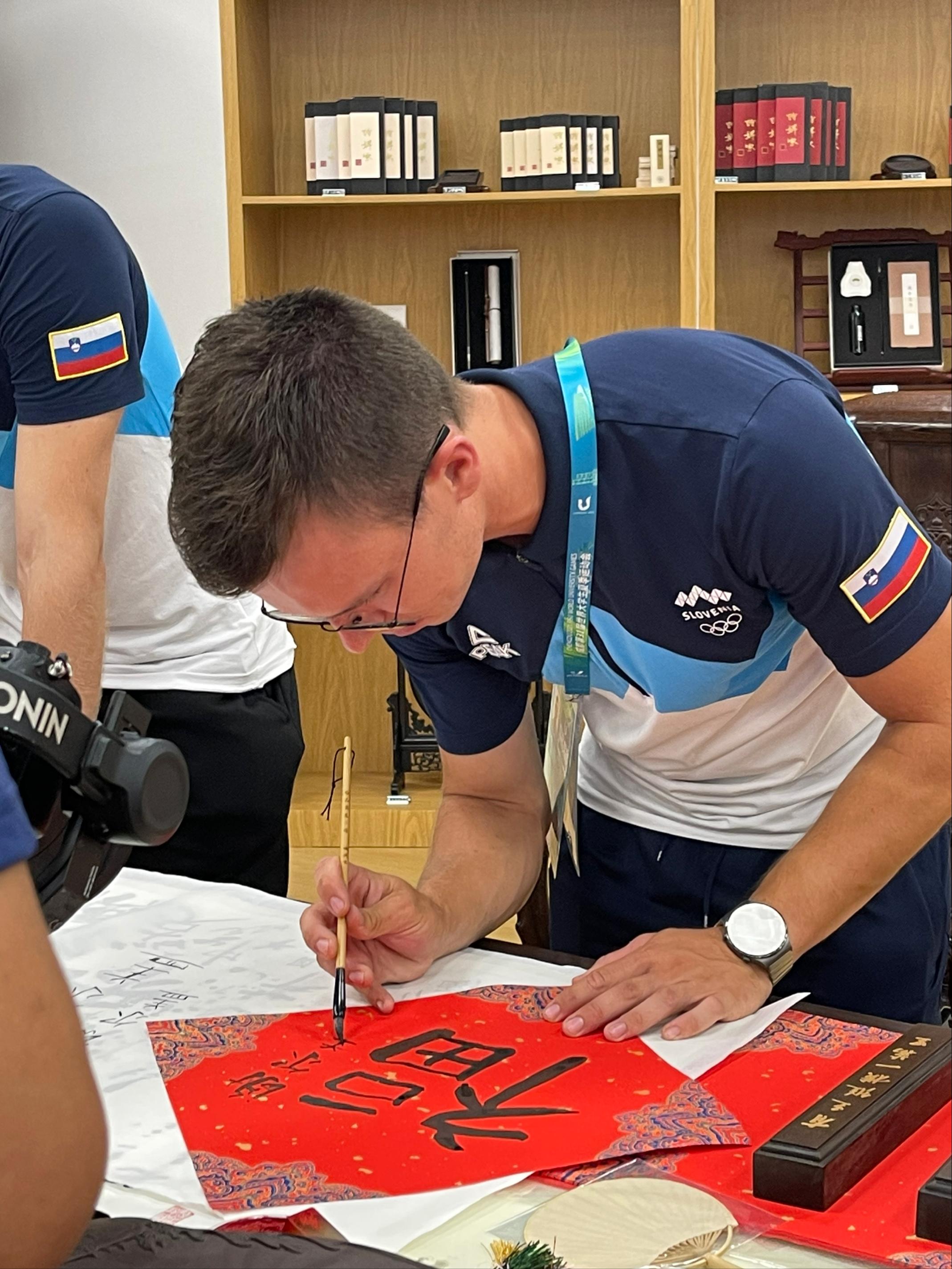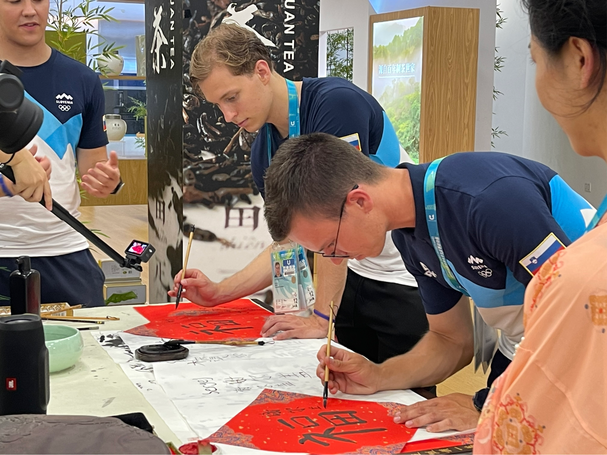 在成都大运村,林芝伊同学和成都高校的“小青椒”志愿者们,以及来自世界各地的大学生运动员们一起生活工作,一起互动交流,加深了彼此的友谊。作为威尼斯37266官网中国画专业的大学生,林芝伊同学在工作间隙,不但帮助外国大学生朋友学习汉语,还给他们讲授国画、书法、篆刻等基本技法,让他们了解和体验中国传统文化的魅力,希望将中国文化的雅致和美好传递给世界各地的朋友们。